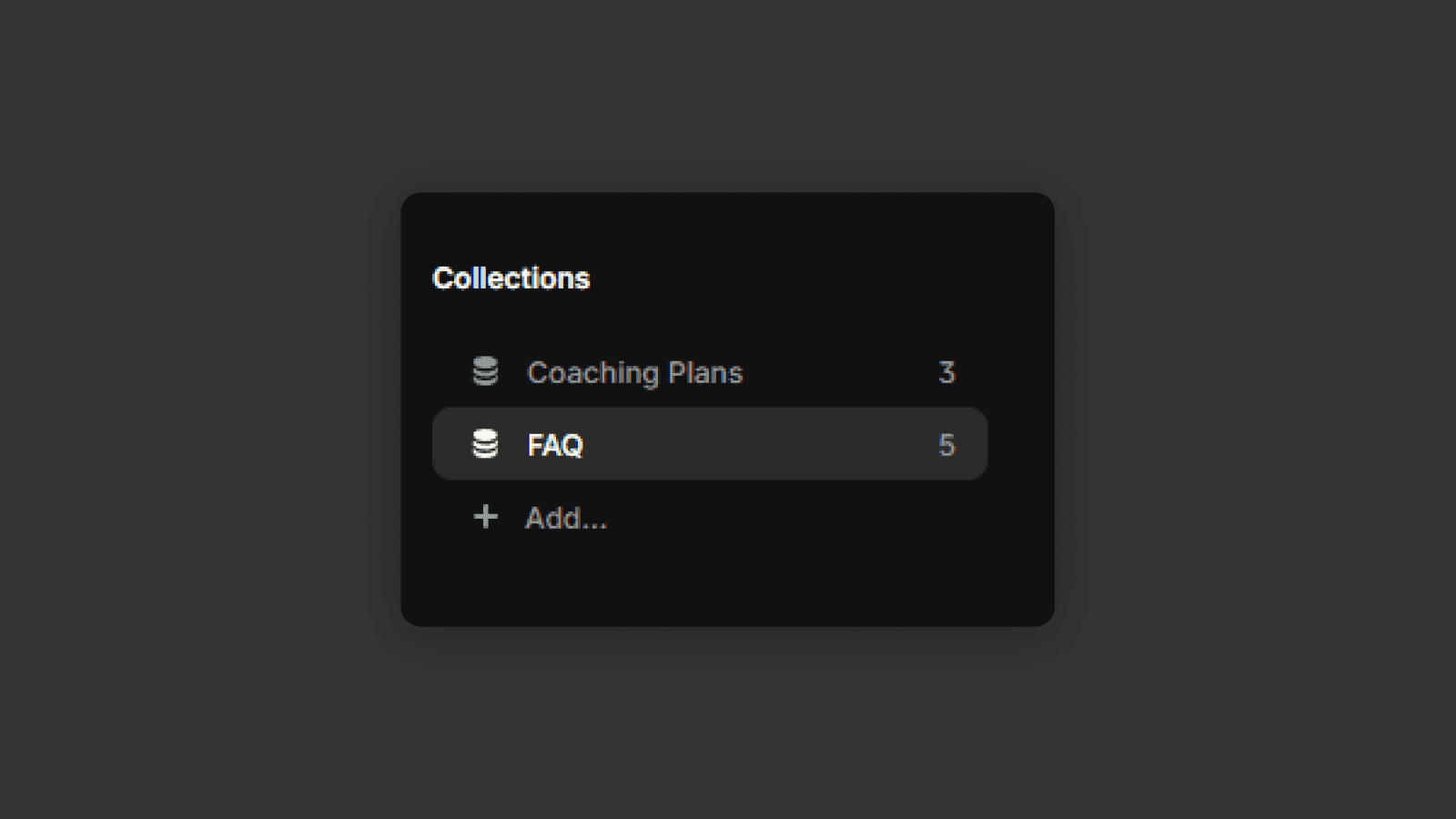 Each collection represents a group of similar items — for example, a FAQ collection, where each item contains a question and an answer, or a blog collection, where each item includes a title, date, author, content, thumbnail image, and more.