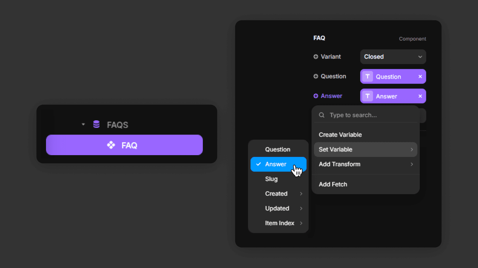 For example, in a FAQ section, you might use a FAQ card component inside the CMS List. You can connect component fields to CMS fields of the same type. For example, text content can use text data from the CMS item.