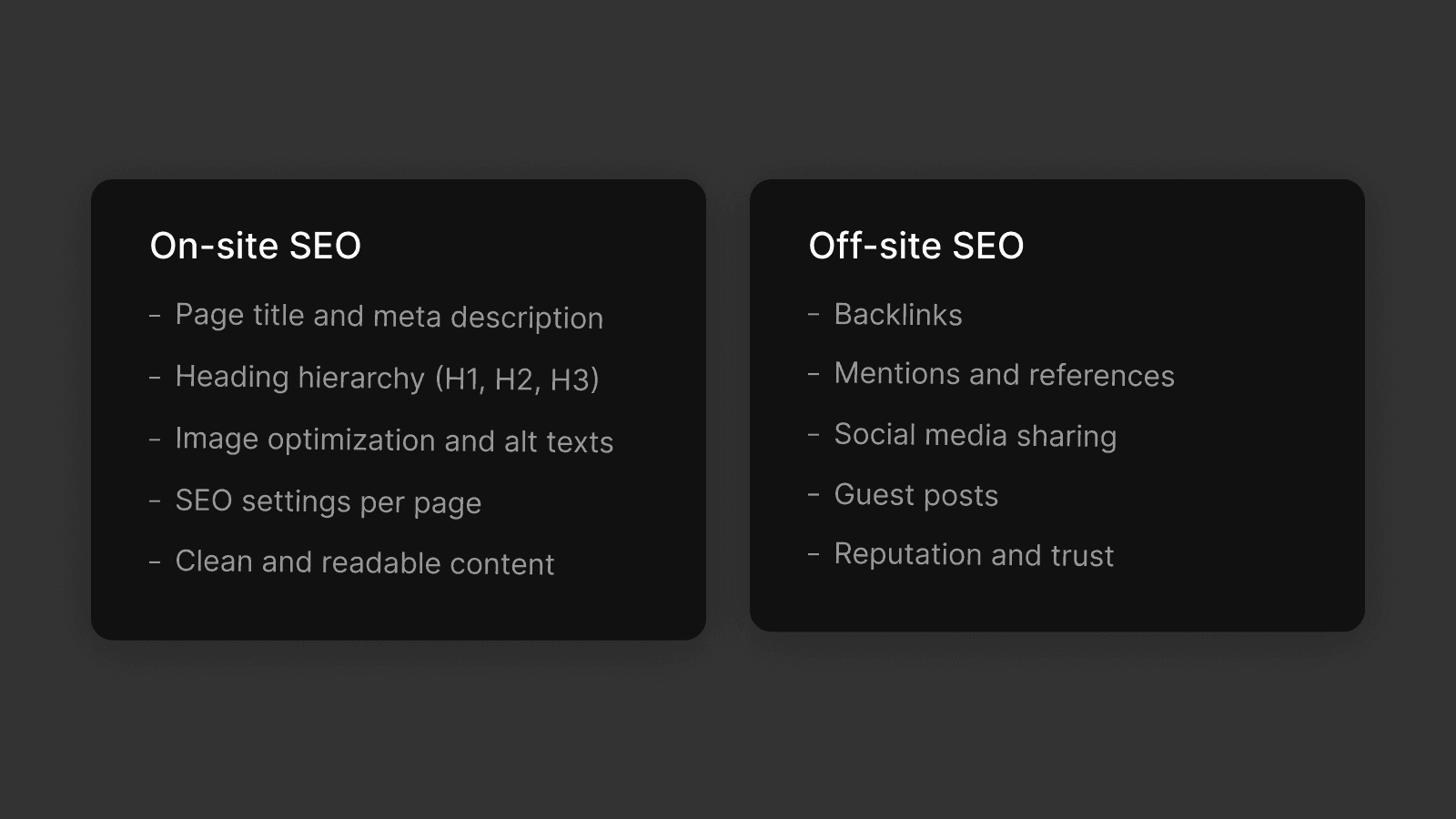 In this tutorial, we’ll focus on on-site SEO, since this is what you can manage directly in Framer.